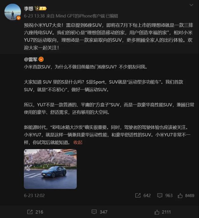 也许从大众的语境来看,雷军这条微博仅是在为即将上市的YU7做个宣传而已。但如果从车圈的角度来看,其指向性就非常明显了。
