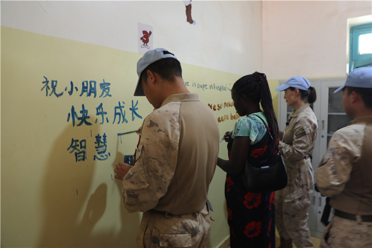 图为维和官兵在留言墙写祝福语。张晓昆摄