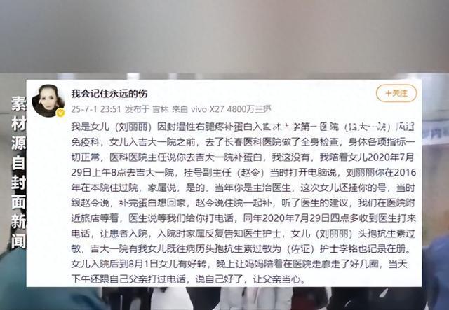 女儿黑救护车上死亡父母最新发声 医疗纠纷持续发酵!7月1日晚,一位母亲在微博上讲述了女儿刘丽丽因风湿性右腿疼痛在吉林大学第一医院治疗期间不幸去世的经历。刘丽丽之前在长春医科医院进行了全身检查,结果显示身体各项指标正常。随后,她和家人于2020年7月29日上午前往吉大一院就诊,主治医生赵令建议住院补蛋白。入院时,家属多次告知医护人员刘丽丽对头孢抗生素过敏,并且病历中有相关记录。