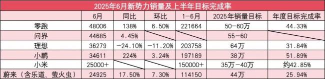 2025年过半,各家新势力都交出了上半年的成绩。在6月份各家销量增长不一,其中,零跑、问界和小鹏三家增长最为迅猛;理想继续守份额,小米则为新车做准备短暂放慢交付速度。从销量来看,零跑、问界双双破4万;理想、小鹏在3.5万上下;小米和蔚来也保持在了2万辆以上。