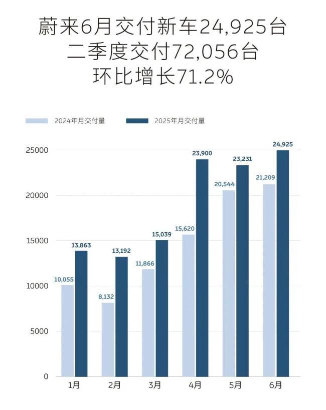 而蔚来公司以微弱的差距,排在小米之后。其6月销量为24925辆,同比增长17.5%,环比增长7.3%。旗下三个品牌销量都在持续向好,其中蔚来品牌6月交付量为14593辆,乐道品牌交付量为6400辆,firefly萤火虫交付量为3932辆,后两者均创年内销量新高。今年1-6月,蔚来公司累计销量为114150辆,同比增长30.6%。