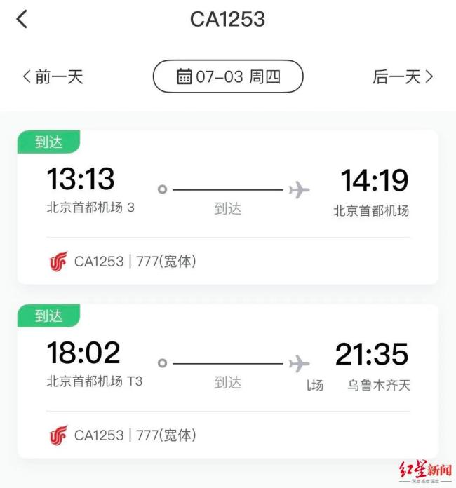 国航App记录还显示,CA1253次航班在7月3日18:02重新从北京首都机场起飞,并于当晚21:35飞抵乌鲁木齐。国航客服人员提到,该架次航班在返航后进行了调整,随后重新起飞。发帖网友也提到,返航后机上人员被要求下机,之后换飞机重新起飞,但因个人原因,这名网友取消了行程。国航客服人员表示,如因机场或航空公司方面原因导致乘客行程变更,所购机票可申请全额退款。