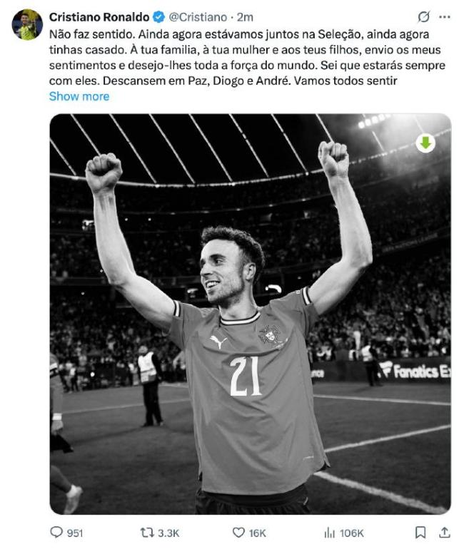 C罗在得知消息后写道:“不愿相信!就在不久前我们还在国家队一起,你刚结婚。我向你的家人、你的妻子和你的孩子们表达最深切的哀悼,并祝愿他们拥有全世界的力量。我知道你会永远与他们同在。愿你和安德烈安息。我们都会非常想念你们。”C罗的母亲也在社交媒体上发文哀悼,称天空将多出两颗闪耀的星星。尽管梅西与若塔在足球生涯上没有太多交集,但他也很快做出回应,发布了一张若塔的黑白照片,并配文“QEPD(愿他安息)”。