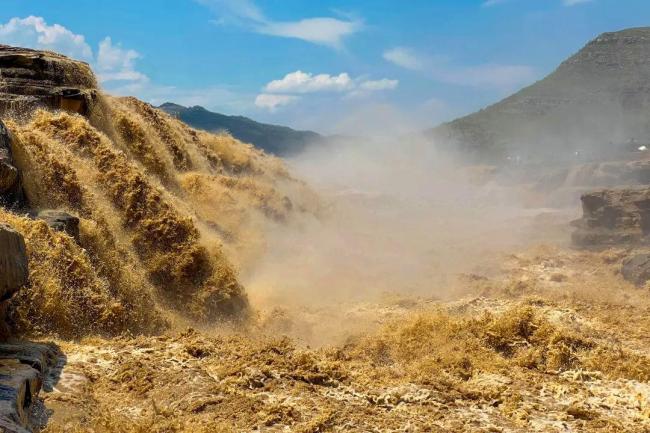 黄河水犹如一条黄色的巨龙,裹挟着雷霆万钧之势,自秦晋大峡谷间奔涌而来,山岩与激流碰撞,苍翠与金黄交织,绘就一幅磅礴的夏日画卷。河水撞击瀑布底部岩石,飞溅的珠玉在半空凝成细密水雾,在骄阳下折射出七彩光晕,横跨于瀑布之上,以排山倒海之势撕裂苍穹,为这雄浑壮阔的景致注入磅礴气韵。
