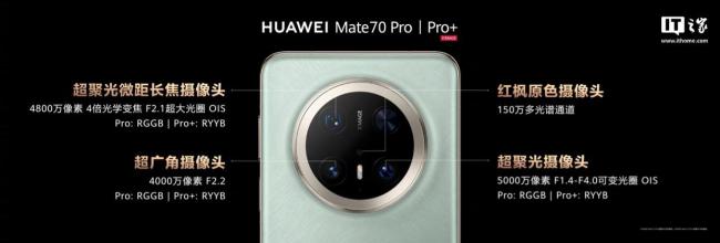 去年11月发布的华为Mate 70 / Pro / Pro+ 系列旗舰手机首次采用了红枫原色影像系统,大幅提升了RYYB色准,主打色彩还原和准确性。华为Mate 70系列主摄采用5000万像素(f/1.4-f/4.0可变光圈,OIS)镜头,另有4800万像素(4X,f/2.1 OIS)长焦镜头和4000万像素(f/2.2,支持最近5cm对焦)超广角镜头。Pro+版本的长焦和超广角镜头均使用RYYB传感器,而Pro版本则采用RGGB传感器。