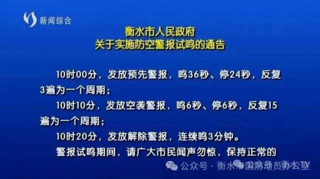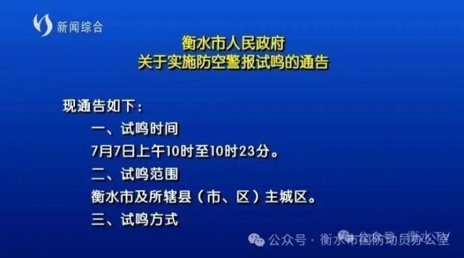 邢台市人民政府决定于2025年7月7日上午10时至10时23分,在市及所辖县(市、区)主城区实施防空警报试鸣。试鸣方式如下: