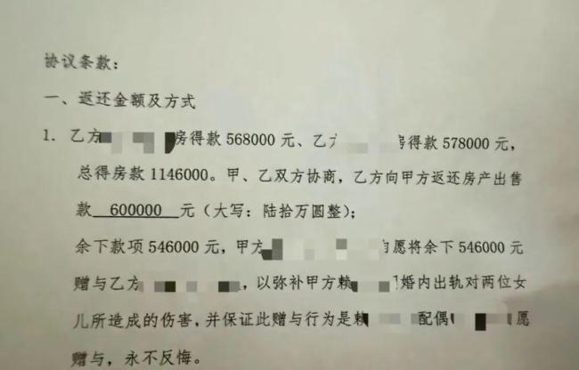 经调解协商,双方最终达成协议:两位女儿各自留下20万元,并分别向赖先生现任妻子转账30万元(共60万元)用于还债。双方签署协议,明确此后无任何债务纠纷。