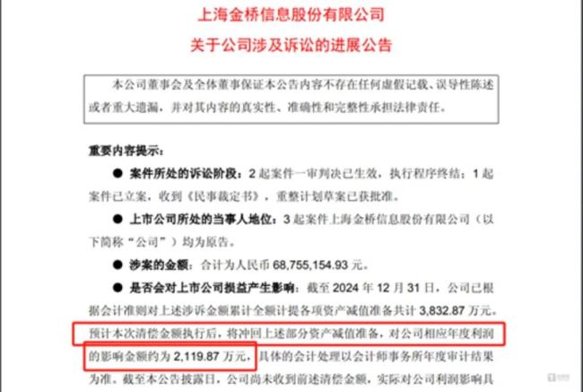 截至去年年末,金桥信息公司已对涉诉(恒大新能源汽车)金额全额计提各项资产减值准备共计3832.87万元。公司预计本次清偿金额执行后,将冲回上述部分资产减值准备,对公司相应年度利润的影响金额约为2119.87万元。