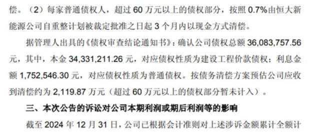 截至去年11月4日,恒大新能源汽车债权申报金额约75.85亿元。其中申报普通债权约49.93亿元,建设工程价款优先债权10.8亿元,有财产担保债权14.95亿元,税款债权约0.17亿元。恒大智能公司债权申报金额约48.79亿元,申报普通债权约49.93亿元,建设工程价款优先债权10.8亿元,有财产担保债权14.95亿元,税款债权约0.17亿元。