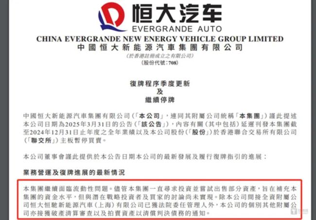 “尽管公司一直在积极寻求战略投资并尝试出售部分资产以缓解资金压力,但截至目前,与潜在投资者的谈判仍未取得实质性进展。此外,恒大汽车旗下部分子公司已进入破产清算程序,部分资产被法院强制拍卖以偿还债务。”