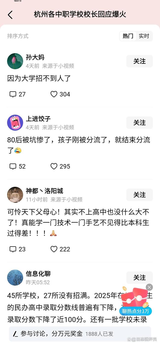 杭州各中职学校校长回应爆火 职业教育备受青睐!杭州中职学校招生情况受到广泛关注。最近,杭州市区各类高中集中统一招生第二段录取工作完成。尽管今年普高招生计划有所增加,且民办高中分数线普遍下降,部分学校未录满,但中职学校的招生却异常火爆。