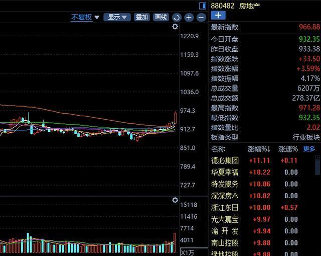 分析师:更猛的楼市刺激政策要来了 股市房市齐上涨!A股和港股的房地产板块突然大幅上涨,带动了相关行业如银行、保险、钢铁、建筑、建材等板块的表现。在A股中,房地产板块整体上涨了3.59%,位居第一。港股房地产板块涨幅更是达到了7%,部分个股甚至上涨超过20%。