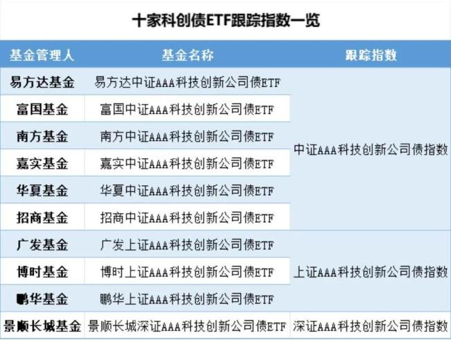 而首批10只科创债ETF中,有6只跟踪中证AAA科技创新公司债指数,3只跟踪上证AAA科技创新公司债指数,1只跟踪深证AAA科技创新公司债指数。