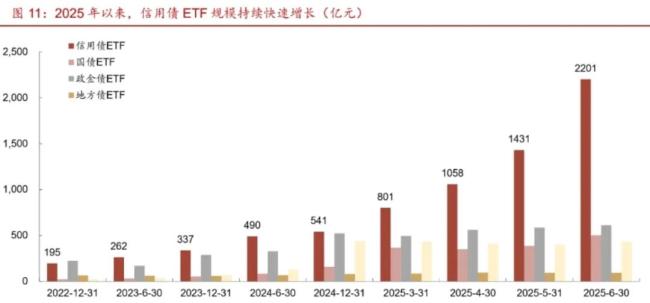 2025年以来,信用债ETF规模持续快速增长,由2024年末541亿元攀升至2025年6月末2201亿元。