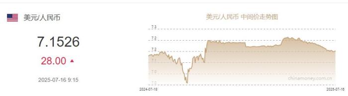 中新网7月16日电 据中国外汇交易中心网站消息,中国人民银行授权中国外汇交易中心公布,2025年7月16日银行间外汇市场人民币汇率中间价为:1美元对人民币7.1526元,下调28个基点。图源:中国外汇交易中心网站截图