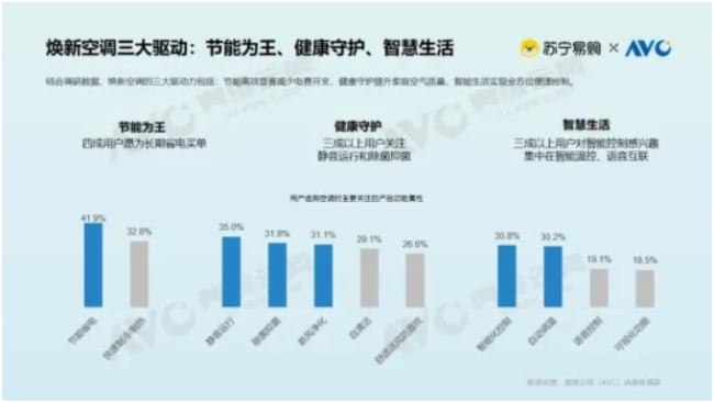 奥维云网联合苏宁易购发布白皮书,深入分析空调发展趋势。报告指出,中国消费者对空调的三大基本刚需分别是:节能、健康和智能化。受访用户中,约42%愿意为了节省电费而选择更节能的产品;超过30%用户对静音、抑菌和新风净化表现出浓厚兴趣;另外还有超30%用户倾向于选购智能化控制、自动调温的空调产品。上述需求,对于企业研发新产品无疑是具有指导性作用的。