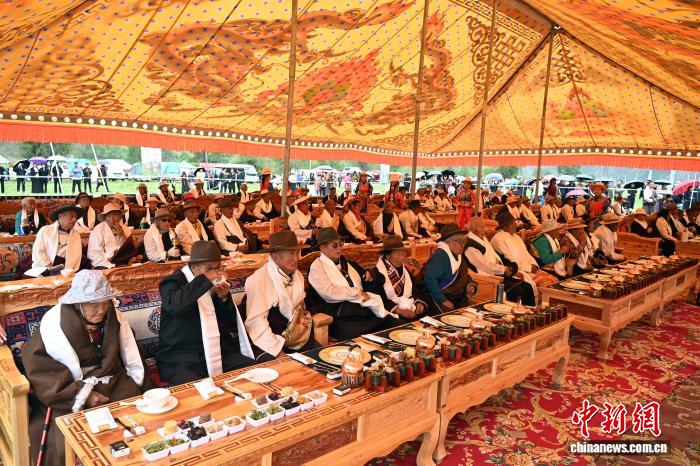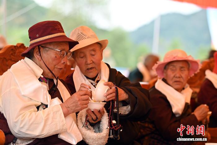 图为当地长寿老人品尝“藏王宴”。中新社记者 九美旦增 摄