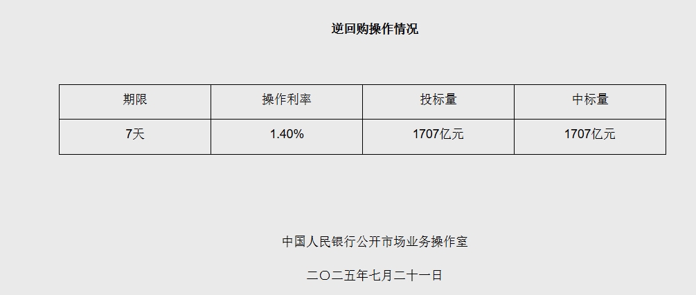 中新网7月21日电 据央行网站消息,2025年7月21日中国人民银行以固定利率、数量招标方式开展了1707亿元逆回购操作。具体情况如下: