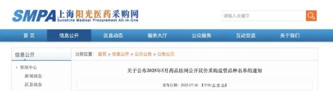 7月16日,上海阳光医药采购网发布《关于公布2025年5月药品挂网公开议价采购监管品种名单的通知》,10个药被纳入重点监控(具体名单见文末附件)。
