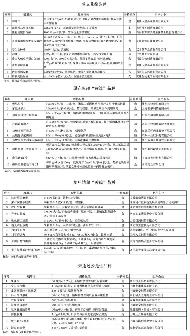 上海还公布了原在库超“黄线”品种、新申请超“黄线”品种以及未通过公允性品种各10个。