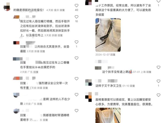不少网友在社交平台上表示,高铁一次性座套方便实用,能避免接触细菌。也有网友指出,尊重个人选择,如果不嫌麻烦就套,只要不影响旁边的人就行。觉得价格不贵,套着方便的话还是可以自备的,就是用完记得拆了。