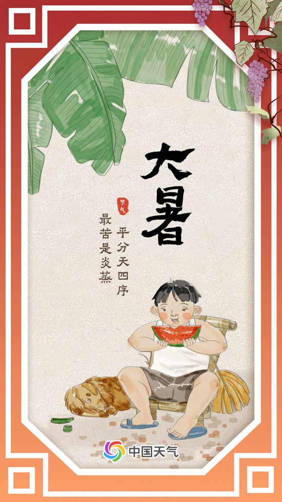 常年大暑时节,我国夏季范围扩展到约530万平方公里,达到一年中的鼎盛。“大者,乃炎热之极也。”大暑是全年最热的节气,正值三伏天开启,我国大部高温频繁,且湿度较大,天气时常又闷又热,民间有“大暑小暑,上蒸下煮“的说法。