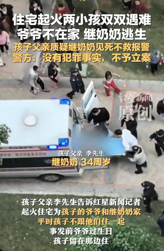 孩子的父亲对此感到非常不解,一直在寻求追究继奶奶的责任,并报了警。然而,警方调查后认定没有犯罪事实,不予立案。在孩子小姨的社交账号上,详细描述了事件经过,引发了大量网友对继奶奶行为的指责。有人认为,如果是亲生母亲遇到这种情况,即使自己无法逃脱,也会尽力让孩子先逃出来。也有人对继奶奶的年龄表示惊讶,觉得她在这个年纪就当上了奶奶,这在同龄人中并不多见。此外,爷爷的态度也令人困惑,他对孙子们的遇难似乎毫无愧疚感,甚至不再认自己的儿子。