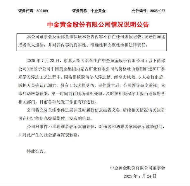 中金黄金表示将充分关注事件进展并及时履行信息披露义务,后续相关情况请关注公司在指定的信息披露媒体上发布的信息。公司对事件不幸遇难者表示沉痛哀悼,对伤者和遇难者家属表示诚挚慰问,并对此产生的社会影响深表歉意。