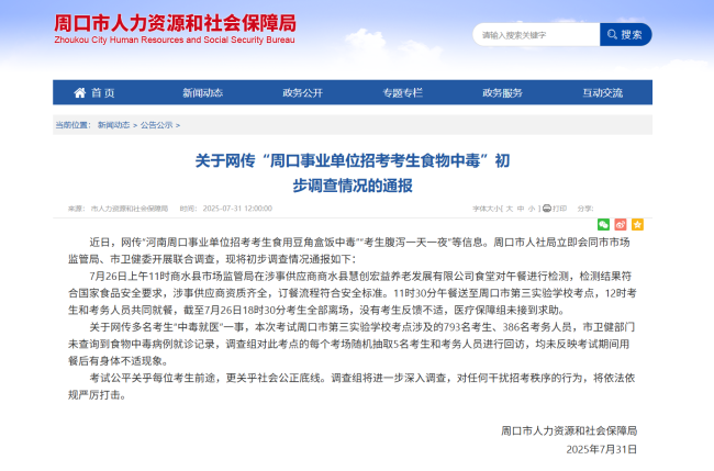 近日,网传“河南周口事业单位招考考生食用豆角盒饭中毒”和“考生腹泻一天一夜”等信息。对此,周口市人社局联合市市场监管局、市卫健委展开了调查,并通报了初步调查情况。