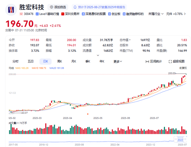 虽然胜宏科技有一定资金压力,但是其在二级市场的表现颇为亮眼。Wind数据显示,截至7月30日,胜宏科技年初至今股价涨幅逾350%,公司总市值已突破1600亿,创历史新高。