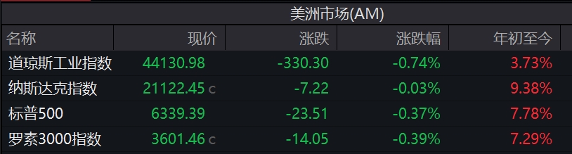 截至收盘,道指跌0.74%,报44130.98点;纳指跌0.03%,报21122.45点;标普500指数跌0.37%,报6339.39点。