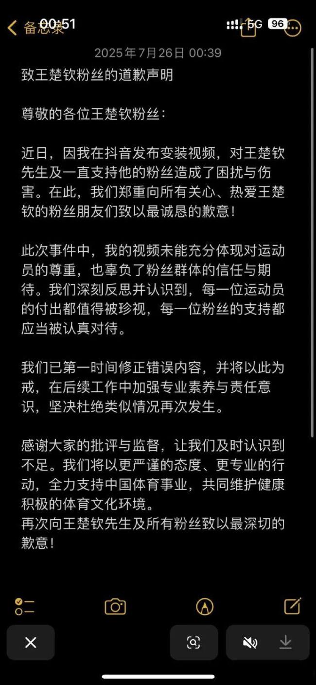 7月26日凌晨,该男子在社交平台上发布道歉声明,表示因发布变装视频对王楚钦先生及其粉丝造成了困扰与伤害,并向所有关心和热爱王楚钦的粉丝朋友们致以最诚恳的歉意。他承认视频未能充分体现对运动员的尊重,也辜负了粉丝群体的信任与期待。通过深刻反思,他认识到每一位运动员的付出都值得被珍视,每一位粉丝的支持应当被认真对待。
