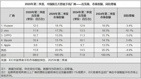 IDC报告显示,2025年第二季度,中国前五大智能手机厂商(以出货量及市场份额计算)分别为华为、vivo、OPPO、小米及苹果。结合此前的数据,魅族手机份额基本上在十名开外,彻底沦为“Others”。