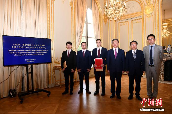 当地时间8月4日,中国驻法国大使馆在巴黎举行法国友人马库斯·德雷特斯(左三)向中方捐赠抗战历史照片交接仪式。中新社记者 李洋 摄
