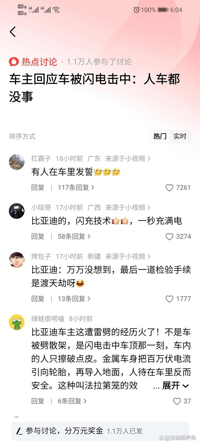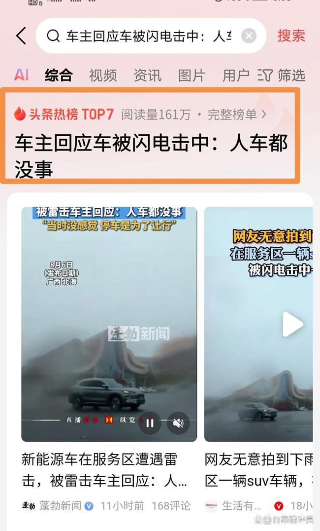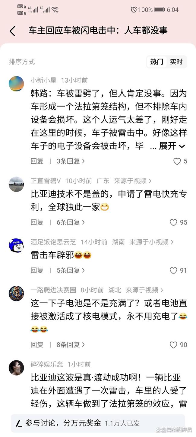 车主回应车被闪电击中:人车没事 淡定面对惊险一刻!最近,一段汽车在行驶中被闪电击中的视频在网上广泛传播,令人感到惊心动魄。视频中,天空乌云密布,电闪雷鸣,一辆正常行驶的汽车突然被一道闪电直接击中,瞬间火花四溅,伴随着巨大的声响,画面极其惊悚。