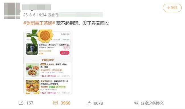 8月6日,“美团 霸王茶姬”话题登上微博热搜第一且持续霸榜。当天,美团通过“神抢手”活动发放霸王茶姬的“伯牙绝弦”兑换券,价值17元,标注“当日23:59到期”。然而,许多用户领券后发现系统强制收回了这些券,券包显示“自取券包不可用”、“暂无可用门店”或直接消失。