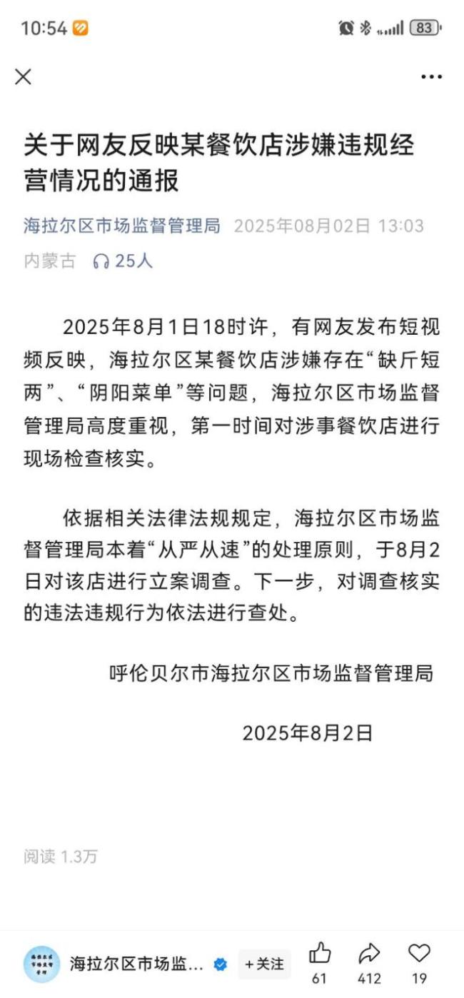 媒体评火锅店阴阳菜单事件 曝光引发调查!近日,内蒙古呼伦贝尔市海拉尔区一家火锅店因存在阴阳菜单和缺斤少两问题被美食博主曝光。博主李先生表示,此前多次接到网友投诉,包括旅行社导游的举报。今年5月,有人再次举报该店不仅有阴阳菜单还存在短斤少两的情况。于是李先生找人卧底取证,确认情况属实后,于7月26日到该店进行证据锁定。