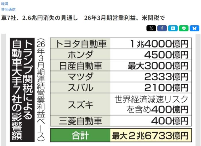 报道称,缩水的规模相当于七家车企上财年营业利润的三成多。各家公司计划加紧采取对策,包括削减成本或改变出口目的地等。