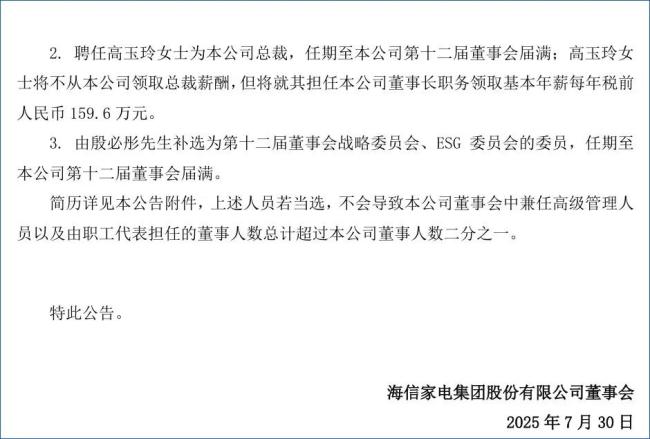 发布中报的同时,海信家电管理层发生了重大人事变动。据《关于拟变更董事、变更总裁并选举职工董事的公告》称,原海信家电总裁、董事胡剑涌,因个人原因辞去总裁、董事、战略委员会以及ESG委员会的委员职务,辞职后不在公司担任职务。高玉玲接任总裁职务,将不领取总裁薪酬,但将就其担任本公司董事长职务领取基本年薪每年税前人民币159.6万元。