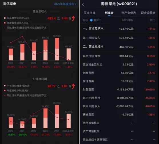报告披露,2025年上半年,海信家电实现营收493.40亿元,同比仅增长1.44%;归母净利润20.77亿元,同比增长3.01%。