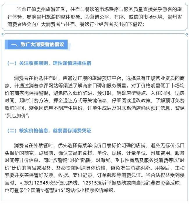 贵州省消费者协会发布致广大消费者及经营者的倡议书,提示消费者谨慎选择住宿,留存消费凭证;提醒经营者规范价格,诚信合规经营。