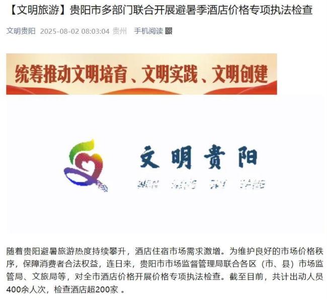贵阳市多部门联合开展避暑季酒店价格专项执法检查,截止8月初共计出动人员400余次,检查酒店超过200家。