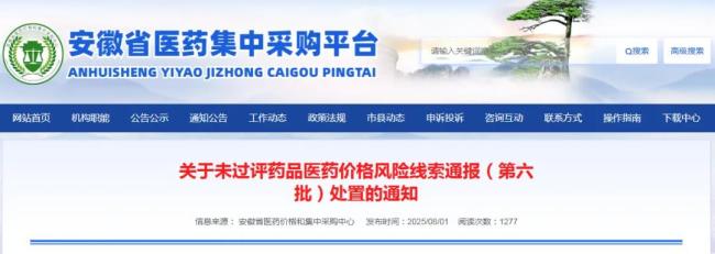 8月1日,安徽医药价格和集中采购中心发布《关于未过评药品医药价格风险线索通报(第六批)处置的通知》,要求相关企业于8月1日至8月6日进行自主降价,对于在规定时限内不降价或降价不达标的药品,将统一列入禁用目录。