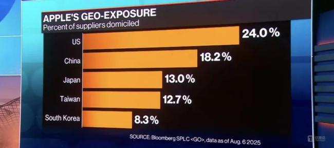 根据彭博的数据,目前位于中国的苹果供应商比例下降至18.2%,仅次于美国的24%。