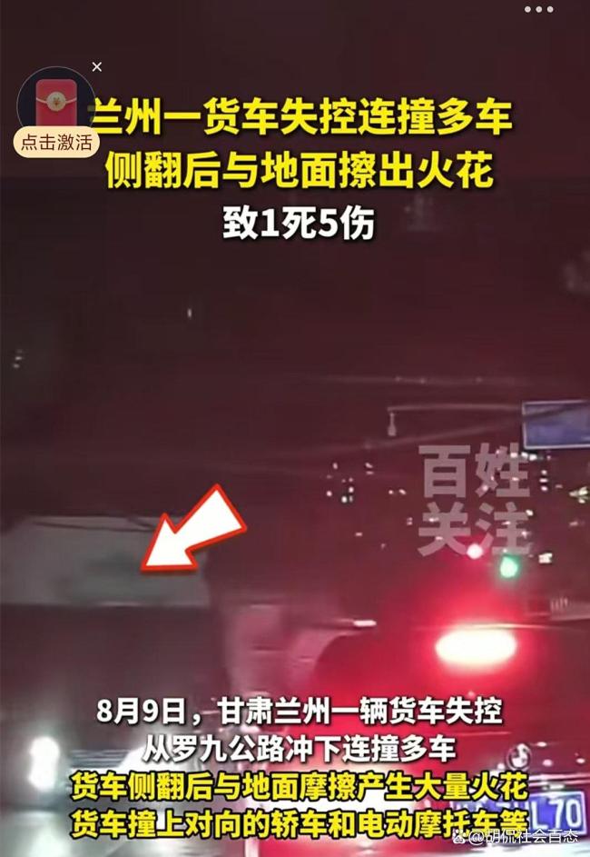 货车失控连撞多车致1死5伤 罗九公路通行规则引热议!8月9日,兰州罗九公路上发生了一起严重的交通事故。一辆货车在行驶中突然失控,沿着山路冲下,连续撞上多辆轿车和电动摩托车。撞击后,货车侧翻,车身与地面摩擦产生大量火花。事故发生后,交警等相关部门迅速到场,将伤者送往医院救治,并展开现场处置工作。