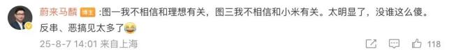 马麟还晒出3张图,第一张图是一个群名为“理想夸夸CLUB”的群聊截图,内容搜集和发布蔚来车主的不文明行为;图三则是捧理想踩蔚来的微博截图合集。对此,马麟表示:“图一我不相信和理想有关,图三我不想和小米有关。太明显了,没谁这么傻。反串、恶搞见太多。”