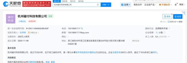 天眼查显示,杭州碰付科技有限公司成立于2024年11月,注册资本200万元,法定代表人为杜学彬,持股100%。