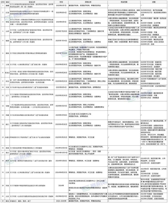 从发布时间看,今年5月后在全国范围内明显提速,8月有新疆、江苏、青海;7月有山西、福建、湖南;6月有云南、黑龙江、河北、甘肃;5月有辽宁、安徽、西藏。从实施进展看,部分省份已明确在今年8月-9月期间正式公布“三进”药品清单,标志着政策进入实质性执行阶段。