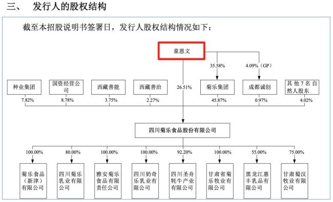 根据菊乐股份的招股书显示,菊乐集团直接持有公司45.87%的股权,系公司的控股股东,公司实际控制人为童恩文。