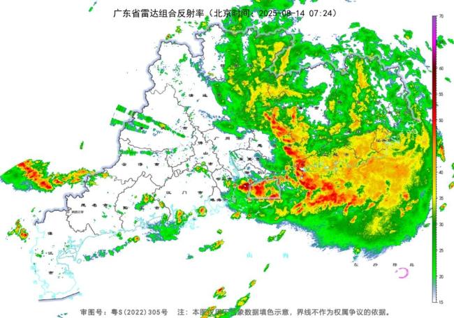 中央气象台预计,8月14日8时至15日8时,东海南部、台湾海峡、南海东北部、巴士海峡、台湾岛北部和南部沿海、福建中南部及沿海、广东东部及沿海、江西南部将有5~7级风,其中福建南部沿海、广东东部沿海、台湾海峡南部海域风力可达8级、阵风9~10级。广东大部、广西大部、福建东南部、江西南部、湖南中南部和西北部、贵州东部等地有大到暴雨,部分地区大暴雨,其中广东北部、广西东北部、湖南南部、江西西南部等地局地可能出现特大暴雨(250~280毫米)。上述部分地区伴有短时强降水(最大小时降雨量20~50毫米,局地可超过70毫米),局地有雷暴大风等强对流天气。